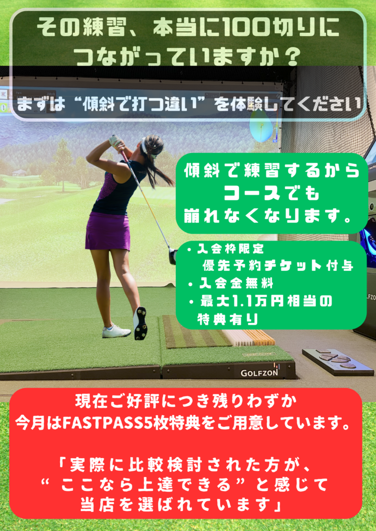 A20.アメリカLPGA公式公認シュミレーター 練習に特化したシミュレーターになります。練習場だけでなく、コースやドライバー、アイアン、パターの練習や練習ラウンドが可能です。ドラコンやアプローチのゲームも楽しめます。毎ショットスイングの撮影を正面と後方からしており、スマホにスイング画像データを送ることが可能です。とても鮮明な映像ですので是非お試しください。